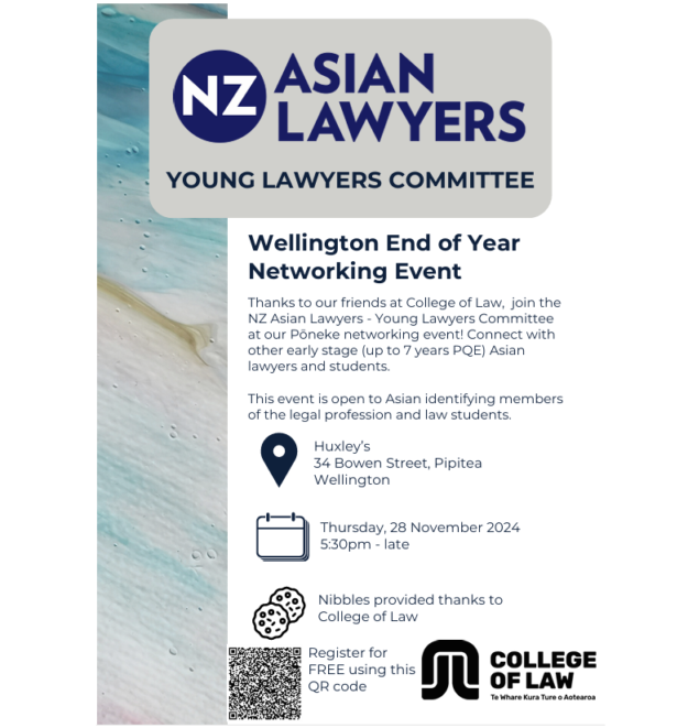 With thanks to the College of Law, we invite you to join the New Zealand Young Asian Lawyers for a networking night at Huxley’s in Wellington. This event is open to Asian-identifying young lawyers and law students. It will be held in person at 34 Bowen Street, Pipitea, Wellington, New Zealand. Connect with legal professionals from various…